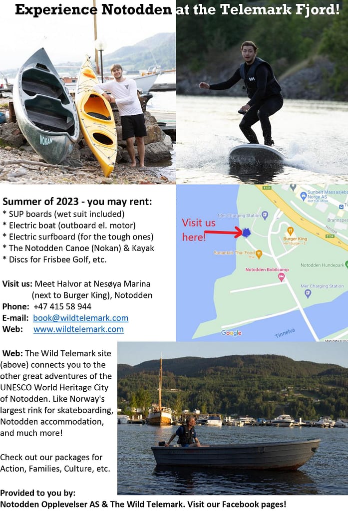 Kom til oss på Nesøya Marina (v Bystranda/Burger King på Notodden), som sommeren 2023 har blant Norges beste utvalg av vannaktiviteter. Opplev hvordan det er å gli over Heddalsvannet i full fart på elsurfebrettet. Du kan både sitte, ligge eller stå på brettet – som fjernstyres med kontroll i hånden. Vår mann Halvor kan lære deg hvordan (se video nedenfor) (Gratis prøving ca 10 min. per person, aldersgrense: 16 år). Fredag er fridag! 🙂