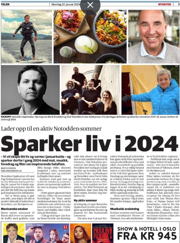 Til slutt, før Heroes of Telemark-bandet entret scenen, fortalte styreleder Dag Herbjørnsrud hva Notodden Opplevelser AS har gjort i 2023 og hva de har planer om i 2024. Herbjørnsrud påpekte at det var støtte fra Notodden Utvikling AS (NUAS), ved John Terje Veseth, og Notodden i Sentrum, v Torgeir Ljosland, som gjorde at Notodden Opplevelser ved Halvor Evensen kunne være reiselivsvert på Nesøya Marina sommeren 2024. Der delta han ut brosjyrer fra Notodden i Sentrum og leide ut elbåt, elsufebrett, kajakker, kanoer og pedalbåt. Det statlige naturreservatet Semsøyene (inklider Kreta) var blant de populære utfartsmålene for tursiter som leide elbåt og seilte over Heddalsvannet fra Nesøya: